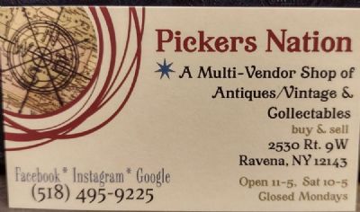 Pickers Nation is a 25 multi-dealer antique/collectible shop. Located conveniently South of Albany, North of Catskill on 9W where you can find unique treasures, beautiful furniture, vintage kitchenware, rare and unusual antiques, primitives, artwork, vintage clothing and much more for your picking pleasure. :)
